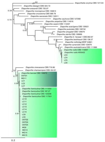 Consensus phylogram of 3582 trees resulting from a Bayesian analysis of the combined ITS, tef1, and tub2 sequence of Diaporthe species. The tree was rooted to Diaporthella corylina (CBS121124). Bayesian posterior probability values are indicated at the nodes. The clusters containing the isolates obtained in this study are highlighted in green.