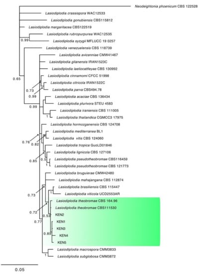 Consensus phylogram of 1762 trees resulting from a Bayesian analysis of the combined ITS, tef1, and tub2 sequence of Lasiodiplodia species. The tree was rooted to Neodeightonia phoenicum (CBS122528). Bayesian posterior probability values are indicated at the nodes. The cluster containing the isolates obtained in this study is highlighted in green.