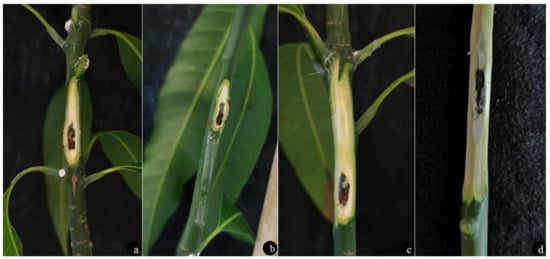 Internal discoloration of woody cankers in mango plants cv. Kensington Pride 30 days after inoculation with (a) Botryosphaeria dothidea; (b) Lasiodiplodia theobromae; (c) Diaporthe foeniculina; (d) D. baccae.