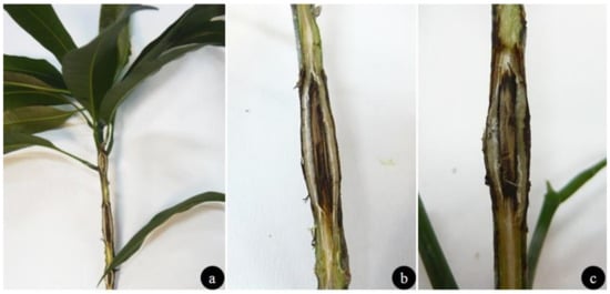 Woody cankers on litchi plants cv. Way Chee 30 days after inoculation with (a,b) Diaporthe rudis; (c) D. baccae.