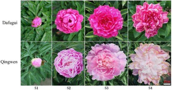 P. lactiflora was cultivated in the National Herbaceous Peony Germplasm Repository of Yangzhou University, Jiangsu Province, China (32°39′ N, 119°42′ E). A red cultivar ‘Dafugui’ and a pink cultivar ‘Qingwen’ were selected for study, and the plants’ morphological parameters and photosynthetic characteristics in the full-bloom stage were measured. During the development of the plants, fresh petals at four different developmental stages (Figure 1), including a flower-bud stage (S1), an initiating bloom stage (S2), a full-bloom stage (S3), and a withering stage (S4), were considered in order to measuring the flower quality and to analyze the anthocyanins, flavones, and flavonols. All the samples were frozen immediately in liquid nitrogen and stored at −80 °C. Then, the frozen petals at four stages were used for analyzing the gene expression.