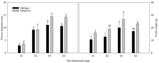 Flower diameter and fresh weight of P. lactiflora cv. ‘Dafugui’ and ‘Qingwen’. S1: flower-bud stage; S2: initiating bloom; S3: bloom stage; S4: withering stage. The values represent the mean ± SDs, and different letters indicate significant differences (p < 0.05).