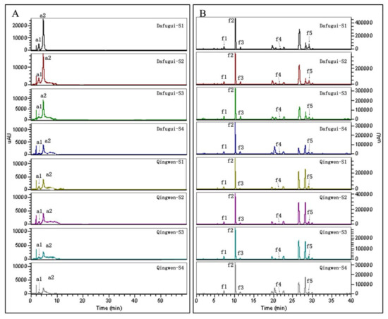 All eight of the chromatograms less than 525 nm, which detected anthocyanins, were found to possess the same number of peaks, with almost the same retention time but different intensity (Figure 4A), and the same phenomenon appeared in the chromatograms less than 350 nm, which detected flavones and flavonols (Figure 4B). These results indicate that the two cultivars had the same composition of anthocyanins, flavones, and flavonols. There were two peaks, a1 and a2, in the chromatograms of anthocyanins in both the cultivars, with the solvent peak (the peak appeared before a1) deducted. The molecular ion of a1 was m/z 611.2 [M+H]+, with two major fragments at m/z 448.9 [M+H-162]+ and 287.2 [M+H-162-162]+ (m/z 449 for cyanidin glucoside and m/z 287 for cyanidin). Based on other papers [18,29], a1 was identified as Cy3G5G. Similarly, a2 was identified as Pn3G5G. Fourteen flavones and flavonols were detected under 350 nm, and five were detected. Peak f1 with the [M+H]+ molecular ion at m/z 627.03 and two major fragments at m/z 464.9 [M+H-162]+ and 303.3 [M+H-162-162]+ were identified as quercetin di-hexoside [30]. Likewise, f2, f3, f4, and f5 were identified as kaempferol di-hexoside, isorhamnetin di-hexoside, quercetin-3-O-rhamnoside, and luteolin-7-O-glucoside, respectively (Table 1).