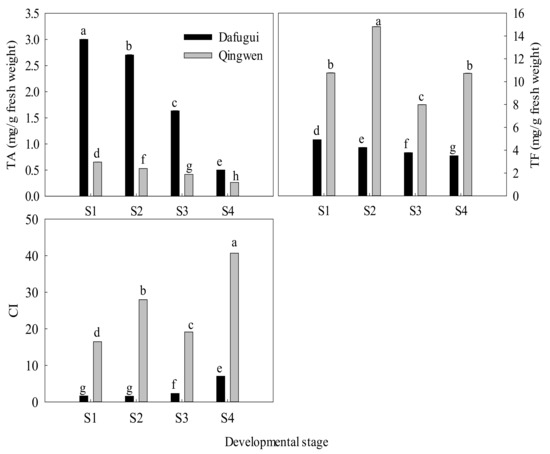 TA and TF in the different developmental stages of flower in P. lactiflora cv. ‘Dafugui’ and ‘Qingwen’. TA: total anthocyanin content; TF: total flavone and flavonol contents; CI: copigmentation index (CI = TF/TA). For stage designations, see Figure 2. The values represent the mean ± SDs, and different letters indicate significant differences (p < 0.05).