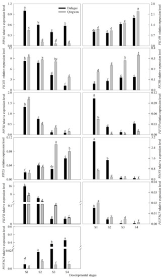 Expression analysis of the anthocyanin biosynthetic genes in the flower of P. lactiflora cv. ‘Dafugui’ and ‘Qingwen’. PlPAL: phenylalanine ammonialyase gene; PlC4H: cinnamate 4-hydroxylase gene; PlCHS: chalcone synthase gene; PlCHI: chalcone isomerase gene; PlF3H: flavanone 3-hydroxylase gene; PlF3′H: flavonoid 3′-hydroxylase gene; PlDFR: dihydroflavonol reductase gene; PlANS: anthocyanidin synthase gene; PlFLS: flavonol synthase gene; PlUF3GT: UDP-Glucose: flavonoid 3-O-glucosyltransferase gene; PlUF5GT: UDP-Glucose: flavonoid 5-O-glucosyltransferase gene. For stage designations, see Figure 2. The values represent the mean ± SDs, and different letters indicate significant differences (p < 0.05).