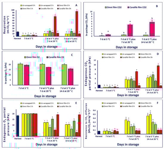 Respiration (A), in-package CO2 (B) and O2 (C), endogenous CO2 (D), O2 (E), and resistance to CO2 diffusion(F) of ‘Simeto’ mandarins. Vertical bars represent the standard deviation (n = 5 for respiration; n = 10 for in-package CO2 and O2; n = 5 for endogenous CO2, endogenous O2, and resistance to CO2 diffusion. For each storage time, means followed by unlike letters are significantly different at p ≤ 0.05. Means separation was accomplished by Duncan’s multiple range test.