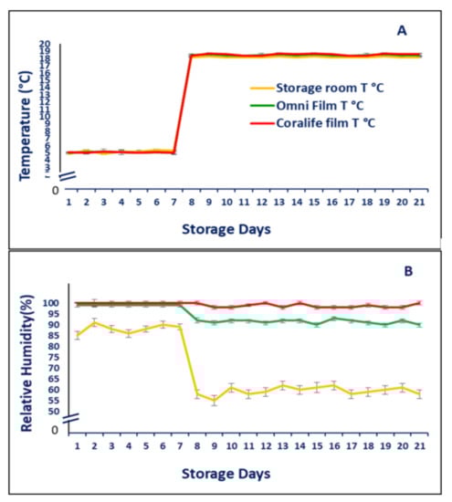 Average temperature (A) or humidity (B) of the storage room or the packages headspace. For each day, means followed by unlike letters are significantly different at p ≤ 0.05. Means separation was accomplished using Duncan’s multiple range test. Vertical bars are the standard deviations of three replications (n = 3).
