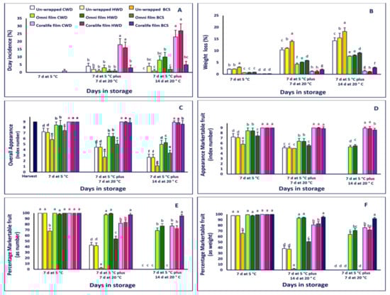 Regarding the PMW, the lowest values are detected in those treatments where the combined effect of decay incidence, decline of overall appearance, and weight loss are higher (Figure 3F).