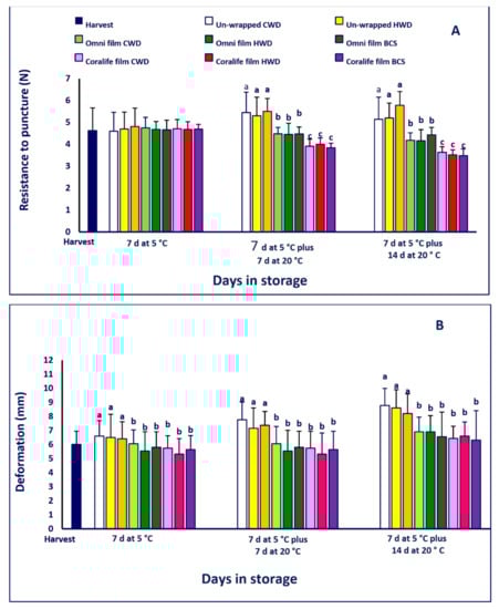 Changes in Resistance to puncture (A) and deformation (B) mness in ‘Simeto’, as affected by fungicidal treatments and packaging. For each storage period, means followed by different letters are significantly different at p ≤ 0.05. Means separation was accomplished by Duncan’s multiple range test. Vertical bars are the standard deviations of (n = 10).