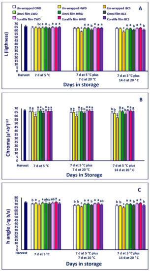 All color components (L*, chroma, and hue angle) are affected by all experimental factors (data not shown). The L* values decrease in all treatments with storage, with the highest reductions occurring in all treatment combinations with SBC, especially in unpackaged and Omni-packaged fruit (Figure 5A). A similar trend is detected for the chroma values (Figure 5B), and the h angle (Figure 5C), with the highest reductions occurring in unpackaged fruit, and in all treatment combinations with SBC (Figure 5B,C).