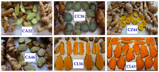 The six Curcuma varieties used in this study were collected by Lam Duong from various locations in Vietnam: CA22 (Quang Nam province), CA46 (Gia Lai province), CC38 (Nghe An province), CL56 (Bac Giang province), CL63 (Quang Tri province), and CZ44 (Gia Lai province). The Curcuma rhizomes varieties were initially planted in a glass greenhouse at Alabama A&M University (Normal, AL, USA) and subsequently cultivated at the Alabama A&M Winfred Thomas Agricultural Research Station (Hazel Green, AL, USA, 34′89″ N, 86′56″ W) as previously described for C. longa cultivation [9]. Each of the fresh Curcuma rhizomes were collected on 18 March 2021, and stored at −20 °C until processed. The mother and daughter rhizomes were, separately, chopped and hydrodistilled using a Likens–Nickerson apparatus for 4 h (see Table 1).