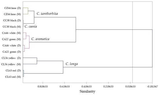 Interestingly, the volatile phytochemistry of C. caesia and C. zanthorrhiza rhizomes are very similar (about 90% similarity). Likewise, the green- and white-colored rhizome essential oils of C. aromatica are very similar (about 95% similarity). The yellow- and red-colored rhizome essential oils of C. longa showed somewhat lower similarity (about 60% similarity).