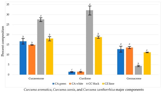 Comparison of the main chemical components of Curcuma aromatica, Curcuma caesia, and Curcuma zanthorrhiza. For each chemical component, bars with the same letter are not significantly different at p ≤ 0.05.