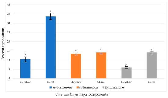 Comparison of the main chemical components of Curcuma longa. For each chemical component, bars with the same letter are not significantly different at p ≤ 0.05.