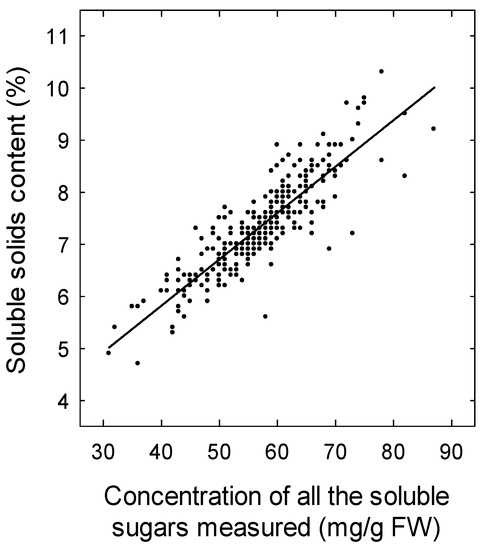 - Pistón, F.; Peréz, A.G.; Sanz, C.; Refoyo, A. Relationship between sugar content and brix degrees in strawberry. Acta Hortic. 2017, 1156, 491–496. [Google Scholar] [CrossRef]