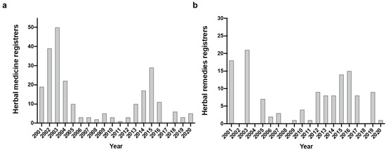 The number of (a) herbal medicine and (b) herbal remedies with sanitary registers in Mexico during 2001–2020. Data obtained from: COFEPRIS (Comisión Federal para la Prevención de Riesgos Sanitarios). 2022; Listados de Registros Sanitarios de Medicamentos. https://www.gob.mx/cofepris/documentos/registros-sanitarios-medicamentos (accessed on 12 August 2021).