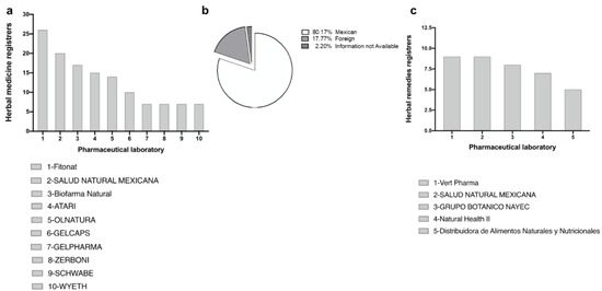 (a) The ten laboratories with the highest number of sanitary registries of herbal medicines in Mexico. (b) Origin of pharmaceutical laboratories with herbal remedies registers in Mexico. (c) The five laboratories with the highest number of sanitary registries of Herbal remedies in Mexico. The figures include all the registers in the period 2001–2020. Data obtained from: COFEPRIS (Comisión Federal para la Prevención de Riesgos Sanitarios). 2022; Listados de Registros Sanitarios de Medicamentos. https://www.gob.mx/cofepris/documentos/registros-sanitarios-medicamentos (accessed on 12August 2021).