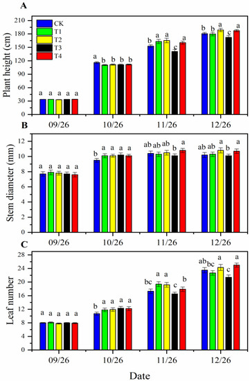 After one week of planting, tomato plants with consistent growth potential were selected to measure plant height, stem diameter and number of leaves. As shown in Figure 1A, the height of tomato plants increased gradually over time. At the end of the first stage (seedling and flowering period, 10/26), the height of tomato plants supplied with a nutrient solution of 1.5 ms·cm−1 (T1, T2, T3, T4) was significantly lower than that of the CK (EC = 3.0 ms·cm−1). By the end of the second stage (fruiting period, 11/26), there were significant differences between the treatments and the control. The plant heights of T1, T2 (EC = 3.0 ms·cm−1) and T4 (EC = 4.5 ms·cm−1) were significantly higher than that of CK, while that of T3 was significantly lower than that of CK. Before topping in the third stage (harvesting period), T2- and T4-treated plants were still significantly higher than CK and other treatments, and there were no significant differences between them. T3 was significantly shorter than CK.
