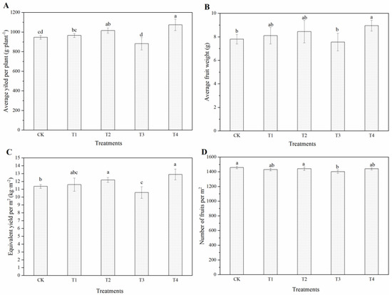 The yield of cherry tomato fruits supplied with different dynamic concentrations of nutrient solution. The average yield per plant (A), average fruit weight (B), equivalent yield per m2 (C) and number of fruits per m2 of cherry tomato fruits (D). The error bars represent the SD. Lowercase letters within the graph are used to compare individual mean values of the treatments, and different letters indicate significant differences (p ≤ 0.05).
