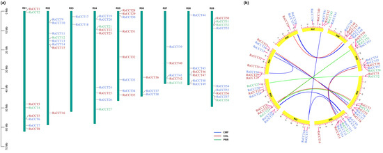 Chromosome localization (a) and duplication analyses (b) of RsCCT genes. Gene codes represented different groups with different colors in (a). Different colored lines in (b) were used to connect synteny genes of different groups.