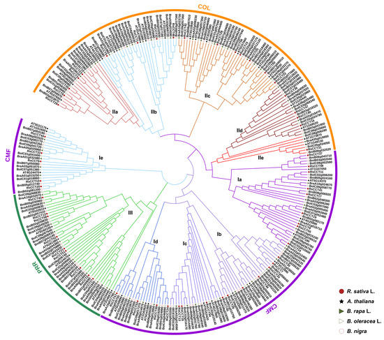 According to the classification criteria and predicted function of AtCCT genes [29,30], three major groups named CMF, COL, and PRR were classified in the phylogenetic tree (Figure 2). A total of 128 CCT genes belong to the CMF group, which was divided into five subgroups, named Ia, Ib, Ic, Id, and Ie. A total of 120 CCT genes belong to the COL group, which was divided into five subgroups, named IIa, IIb, IIc, IId, and IIe. The PRR group showed the smallest number of CCT genes (46 CCT genes), and was classified into one subgroup, named III. The number of CCT genes from Brassica species and R. sativus in each subgroup was balanced, indicating that CCT genes had similarly expanded in these genomes. Notably, we found that all clades contained CCT genes from R. sativus and A. thaliana, indicating that these original CCT genes existed before the differentiation of R. sativus and A. thaliana.