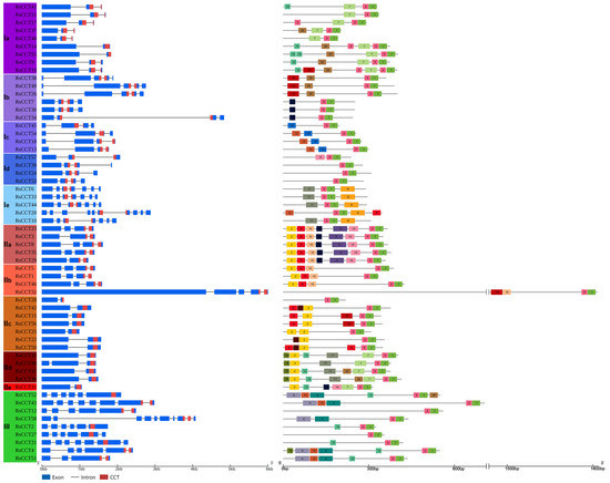 Gene structure and conserved motifs of RsCCT. Different subgroups of RsCCT genes are highlighted in different colors. The gene structure of RsCCT genes was generated from the GSDS website. The blue block represented the coding sequence (CDS) while the black line indicated the introns. The red square represented the location of the CCT conserved domain. The conserved motifs in RsCCT proteins were identified through the MEME software. Different colored blocks represented different motifs.