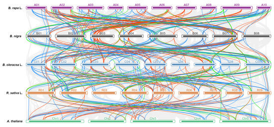Syntenic relationship among A. thaliana, B. rapa, B. nigra, B. oleracea, and R. sativus constructed according to orthologous gene pair positions. Different color curves linked AtCCT genes with their orthologous genes in B. rapa, B. oleracea, and R. sativus.