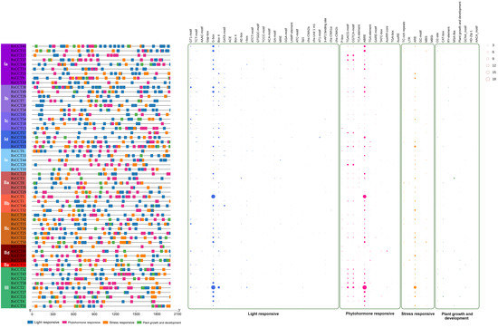 Cis-element analysis in RsCCT genes. Different color squares represented the distribution of different cis-elements in the RsCCT gene promoter. Circles of different sizes represent the number of different promoters of cis-elements in RsCCT genes.