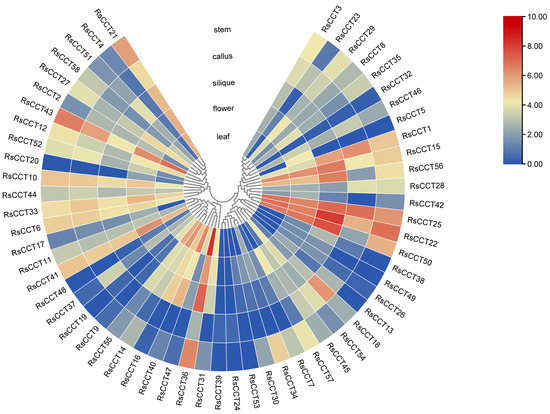 Tissue-specific expression pattern of RsCCT genes. The heatmap was constructed based on the log2 (FPKM + 1) values of RsCCT genes. Red and blue, respectively, indicate higher and lower transcript abundance.