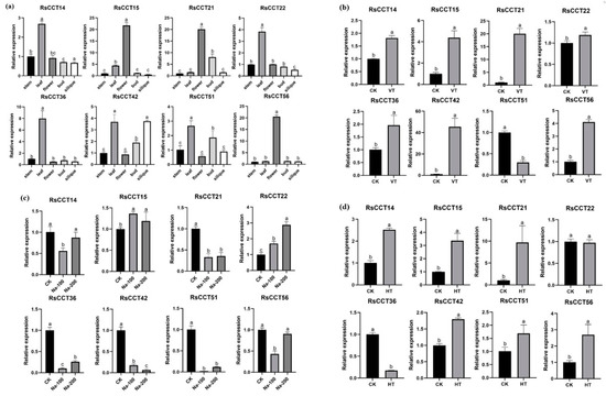 The expression levels of representative RsCCT genes (a) of five radish tissues (stem, leaf, flower, bud, and siliques) under (b) vernalization treatment, (c) salt stress, (d) heat stress. Each error bar indicates standard deviation among three biological replicates. The value with different letter indicates significant difference at p < 0.05.