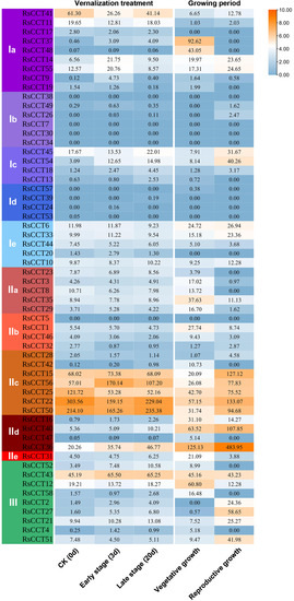 The expression of RsCCT genes from the vegetative stage to the reproductive stage (Figure 8) was analyzed according to available RNA-seq data [34]. Most RsCCT genes showed differential expression patterns at the two stages. The expression level of IIc subgroup genes, except RsCCT42, were upregulated at the reproductive stage, suggesting that these genes may be closely related to the bolting and flowering of radish. While RsCCT37 and RsCCT48 were highly expressed only at the vegetative stage (Figure 8).