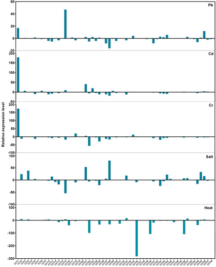 To investigate the expression patterns of RsCCT under various abiotic stress treatments, we compared the differences in the expression changes of RsCCT genes under Cd, Cr, Pb, and salt stresses, using published RNA-seq data [36,37,38,39], as well as under heat stress, using measured RNA-seq data (Figure 9). The expression patterns of most RsCCT genes were different under the various abiotic stresses. Specifically, RsCCT1 exhibited upregulated expression under three heavy metal (Cd, Cr, and Pb) stresses. The expression pattern of RsCCT15 was upregulated, and the expression pattern of RsCCT28 was downregulated under Pb stress. The expression pattern of RsCCT21 was upregulated under Cd stress, while the expression pattern of RsCCT22 was downregulated under Cr stress. Under salt stresses, the expression patterns of RsCCT16 and RsCCT40 were upregulated and the expression patterns of RsCCT50 and RsCCT51 were downregulated. Under heat stress, the expression patterns of RsCCT22, RsCCT36, RsCCT40, and RsCCT50 were downregulated (Figure 9). The changes in RsCCT expression profiles indicate that they might play important roles during abiotic stress response.