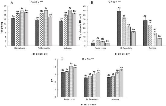Total soluble solids (TSS) (A), titratable acidity (TA) (B), and pH (C) of three pomegranate genotypes (‘Santa Lucia’, ‘Di Benedetto’, and ‘Arborea’) during I–II–III–IV ripening stages. All the data are expressed as mean ± SE (standard error). Different uppercase letters indicate significant differences during ripening stages in the same accession, and different lowercase letters indicate significant differences in the same ripening stages for the three accessions, in accordance with Duncan’s multiple range test (p = 0.05). Levels of significance for the two-way ANOVA (Genotype (G) × Stages (S)) are indicated as *** (p < 0.001).