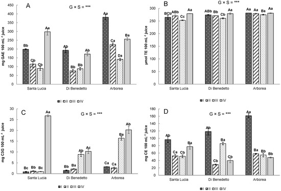 Total polyphenol (A), DPPH—antioxidant activity (B), anthocyanin content (C), and flavonoid content (D) of three pomegranate accessions (‘Santa Lucia’, ‘Di Benedetto’, and ‘Arborea’) during I–II–III–IV ripening stages. All the data are expressed as mean ± SE (standard error). Different uppercase letters indicate significant differences during ripening stages in the same accession, and different lowercase letters indicate significant differences in the same ripening stages for the three accessions, in accordance with Duncan’s multiple range test (p = 0.05). Levels of significance for the two-way ANOVA (Genotypes (G) × Stages (S)) are indicated as *** (p < 0.001).