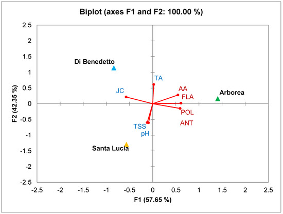 Principal component analysis (PCA) was used to highlight the differences in the three pomegranate genotypes (‘Santa Lucia’, ‘Di Benedetto’, and ‘Arborea’), concerning the changes in pomological, qualitative, and chemical traits. The first two principal components (PCs) disclosed 100% of the cumulative variance (Figure 4), with PC1 explaining 57.65% and PC2 42.35%. The PC1 was positively correlated with nutraceutical parameters and juice content, while PC2 was negatively correlated with TSS and pH. Several studies demonstrated that multivariate data analysis is a valid tool to highlight similarities and differences between all analyzed traits [27,52,53]. The nutraceutical and antioxidant traits showed a correlation with ‘Arborea’ genotype, while juice content, colorimetric index, and titratable acidity were correlated positively with ’Di Benedetto’ fruits. ‘Santa Lucia’ pomegranate showed the highest values of TSS and pH.