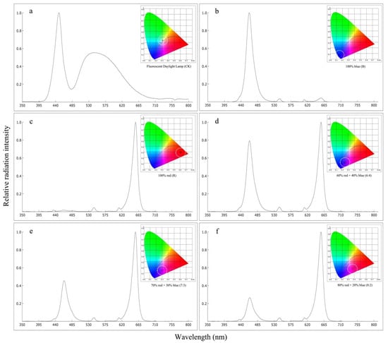 Relative spectral distribution of the fluorescent daylight lamp and LEDs. (a) Fluorescent Daylight Lamp as control (CK), (b) 100% blue (B), (c) 100% red (R), (d) 60% red + 40% blue (6:4), (e) 70% red + 30% blue (7:3), (f) 80% red + 20% blue (8:2). The white circle shows the center of the spectral component marker.