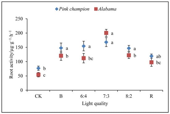 The root activity of ‘Pink Champion’ and ‘Alabama’ showed the trend of rising first and then going downward with the increase of the red light content (Figure 2), and ‘Pink Champion’ was higher than ‘Alabama’ on a whole, except the 7:3 treatment. ‘Pink Champion’ and ‘Alabama’ all obtained the largest value of root activity in 7:3 treatment, and were significantly higher than CK. The root activity of ‘Pink Champion’ and ‘Alabama’ under B were higher than R, and the difference was not significant.