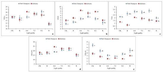 Effects of different light qualities on leaf chlorophyll content of Anthurium ‘Pink Champion, Alabama’ ((a) Chl a, (b) Chl b, (c) Carotenoid, (d) Chl a + b, (e) Chl a/b.). The statistical analysis has been carried out separately for each cultivar. Vertical bars indicate standard error (n = 5). Different letters represent a significant difference at p < 0.05 among treatments by the Duncan’s multiple range test.