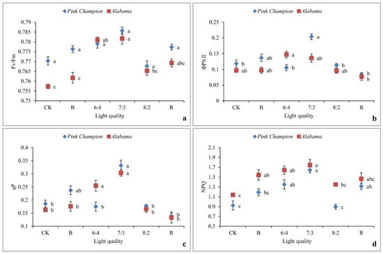 Effects of different light qualities on chlorophyll fluorescence parameters of Spathiphyllum Anthurium ‘Pink Champion, Alabama’ ((a) Fv/Fm, (b) ΦPSII, (c) qP, (d) NPQ.). The statistical analysis has been carried out separately for each cultivar. Vertical bars indicate standard error (n = 5). Different letters represent a significant difference at p < 0.05 among treatments by the Duncan’s multiple range test.