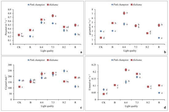 Effects of different light qualities on photosynthetic parameters of Anthurium ‘Pink Champion, Alabama’ ((a) Pn, (b) gs, (c) Ci, (d) E.). The statistical analysis has been carried out separately for each cultivar. Vertical bars indicate standard error (n = 5). Different letters represent a significant difference at p < 0.05 among treatments by the Duncan’s multiple range test.