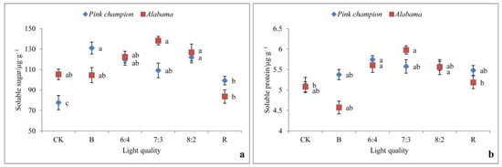 With the increase of the red light ratio, the soluble sugars content of ‘Pink Champion’ and ‘Alabama’ were rising first and then going downward (Figure 6a). ‘Pink Champion’ obtained the largest soluble sugars content in B, followed by 6:4, and the lowest value in CK. ‘Alabama’ obtained the largest soluble sugars content under 7:3 treatment, and the minimum value under R treatment. The soluble sugars content of ‘Pink Champion’ and ‘Alabama’ in B were higher than R treatment as a whole.