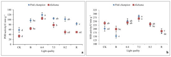 Effects of different light qualities on POD (a) and SOD (b) activity of Anthurium ‘Pink Champion, Alabama’. The statistical analysis has been carried out separately for each cultivar. Vertical bars indicate standard error (n = 5). Different letters represent a significant difference at p < 0.05 among treatments by the Duncan’s multiple range test.