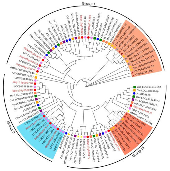 To identify the RR-type MYB-related TFs (SlMYBR) in tomato, the Arabidopsis RR-type MYB domain was used as the query to search the tomato genome databases. Nine RR-type MYB-related TFs of Arabidopsis thaliana [18] were used as queries to BLAST with S. lycopersicum, S. tuberosum, Amborella trichopoda, Brachypodium distachyon, Z. mays, Oryza sativa, Vitis vinifera, Cucumis sativus, Malus domestica and Citrus clementina genomes (E-value < e−50) in NCBI (https://www.ncbi.nlm.nih.gov/, accessed on 20 October 2021). The phylogenetic tree of the searched RR-type MYB-related TFs was constructed by neighbor-joining method. The online software EvolView [29] (https://evolgenius.info//evolview-v2/, accessed on 17 March 2022) is used to beautify the phylogenetic tree.