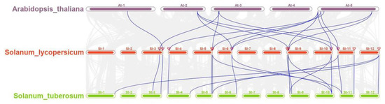 Synteny analysis of A. thaliana, S. lycopersicum and S. tuberosum.