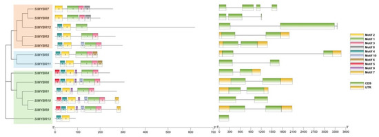 Gene structure and conserved motifs of SlMYBR genes.