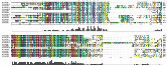 Multiple sequence alignment of SlMYBR proteins. ‘*’ indicates positions which have a single, fully conserved residue.