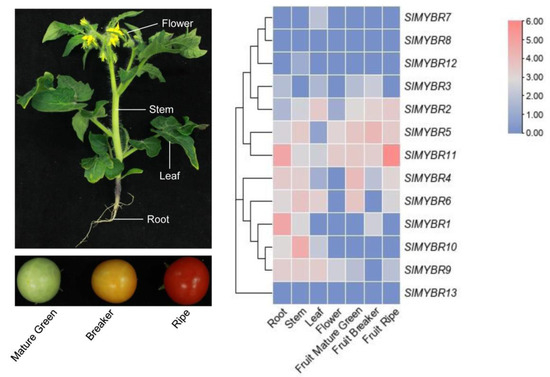 The expression patterns of SlMYBR genes in different tissues of S. lycopersicum. The left showed the sampled tissues of tomato, and the right showed the expression patterns of SlMYBR genes.
