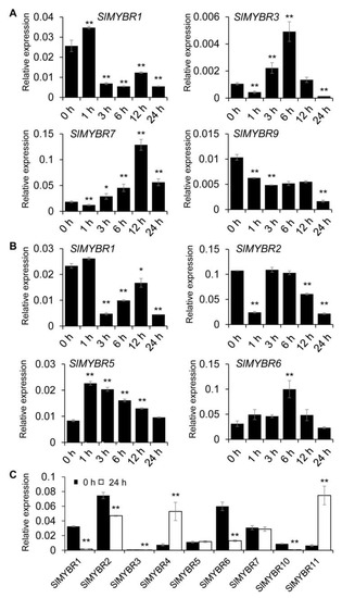 Expression analysis of SlMYBR genes under different exogenous hormone treatment: (A) GA; (B) SA; (C) ABA. The qRT-PCR data represent the mean of three biological replicates (±SD). Asterisks indicate significant differences from the 0-h sample using a Student’s t-test (** p < 0.01; * p < 0.05).