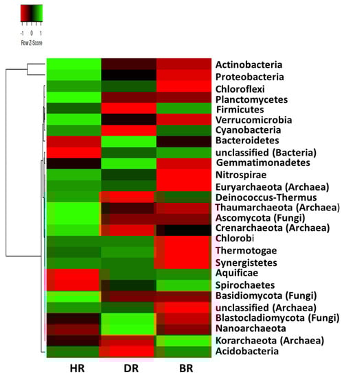 Phyla heatmap of soil microorganism affiliated with the tomato plants. Each plot with particular color functioned as a saturation gradient employing the mean value with a z-score. HR = rhizosphere soil of healthy tomato plant; DR = rhizosphere soil of diseased tomato plant; and BR = bulk soil obtained from the soil without tomato plantation.