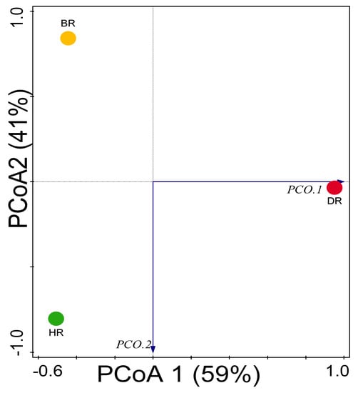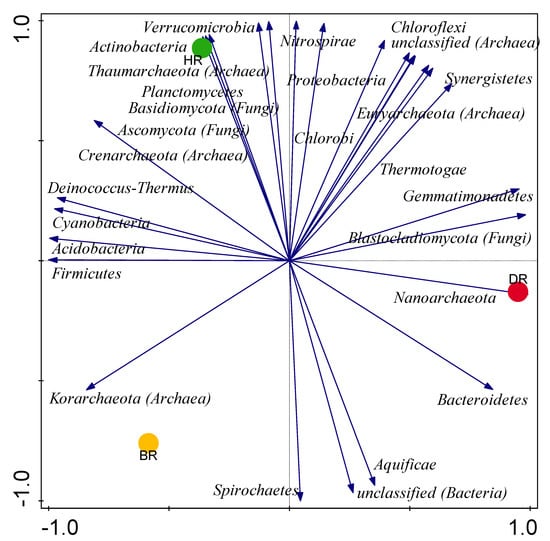 PCA graph of phyla of the community of microbes present in the rhizosphere and bulk soils. Each arrow shows the impact of the microbial metagenomes, axis 1 (59%) and axis 2 (41%) explain the variations, employing the Bray–Curtis dissimilarity matrix. HR = rhizosphere soil of healthy tomato plant; DR = rhizosphere soil of diseased tomato plant; and BR = bulk soil obtained from the soil without tomato plantation.